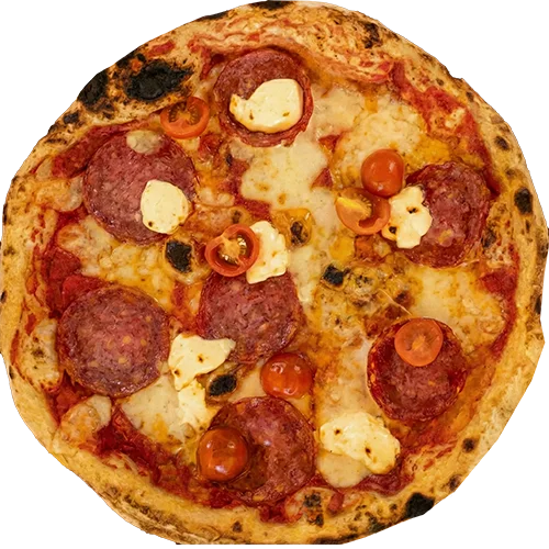 tomato sauce, mozzarella fior di latte, salami Napoli, mascarpone cheese, cherry tomatoes