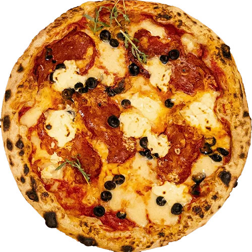 tomato sauce, mozzarella fior di latte, salami Napoli, kalamata olives, onion