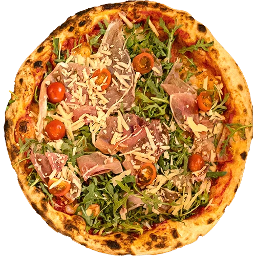 tomato sauce, mozzarella fior di latte, Parma ham, cherry
